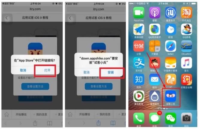 3,苹果App Store中下载软件,下载安装“试客小兵”,安装完成后,根据系统上的指引和图示,去你的苹果手机“设置”中,信任一下这个软件。