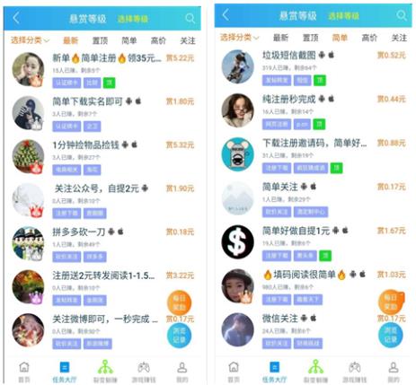 然后你就可以去“任务大厅”做任务赚钱,任务的形式很多,我一般只看价格如何的,挑选自己喜欢的就行。挑选任务有个技巧,将任务的名称输入到右上角的搜索位置,和任务名称相关的任务都会出来,选择佣金最高的做。