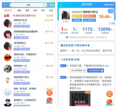 扫码完成注册下载安装,然后大家在任务大厅里搜索“淘特”任务,一单任务佣金可多可少,佣金都是自己定义的,别人按要求做了,我们审核通过就会给对方付出这笔佣金。